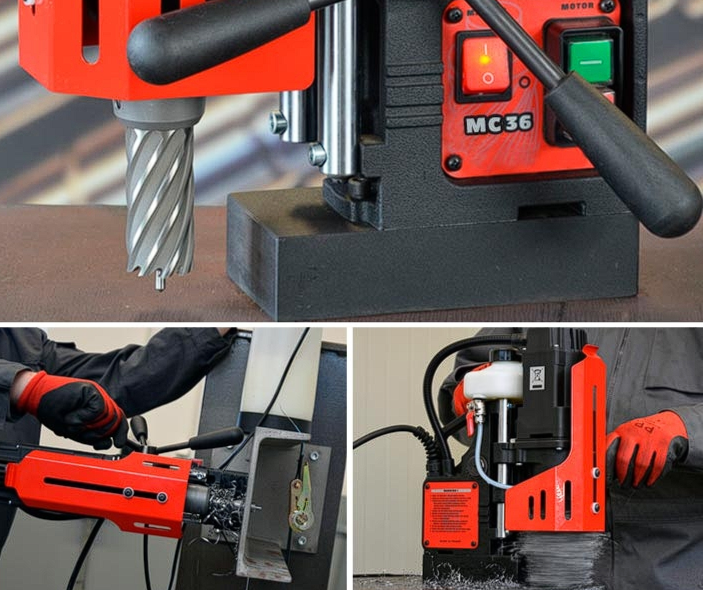 Благодаря новейшим технологиям масса станка составляет всего 9,95 кг, а увеличенная мощность двигателя 1050 Вт и применение специальной обмотки ротора, устойчивой на предельных нагрузках, позволяет МС-36 выполнять сквозные отверстия корончатым сверлом до 50 мм.